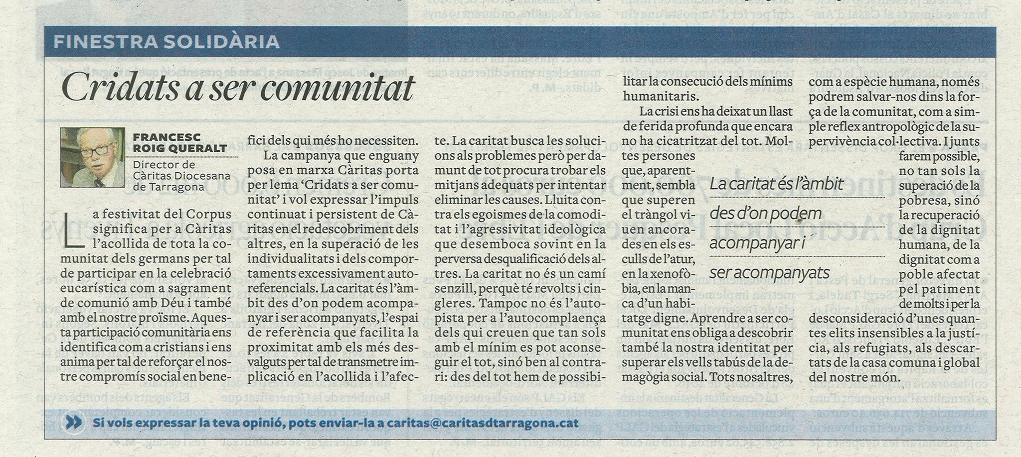 Com cada setmana, fem ressò de l'article de la "Finestra Solidària" que es publica al